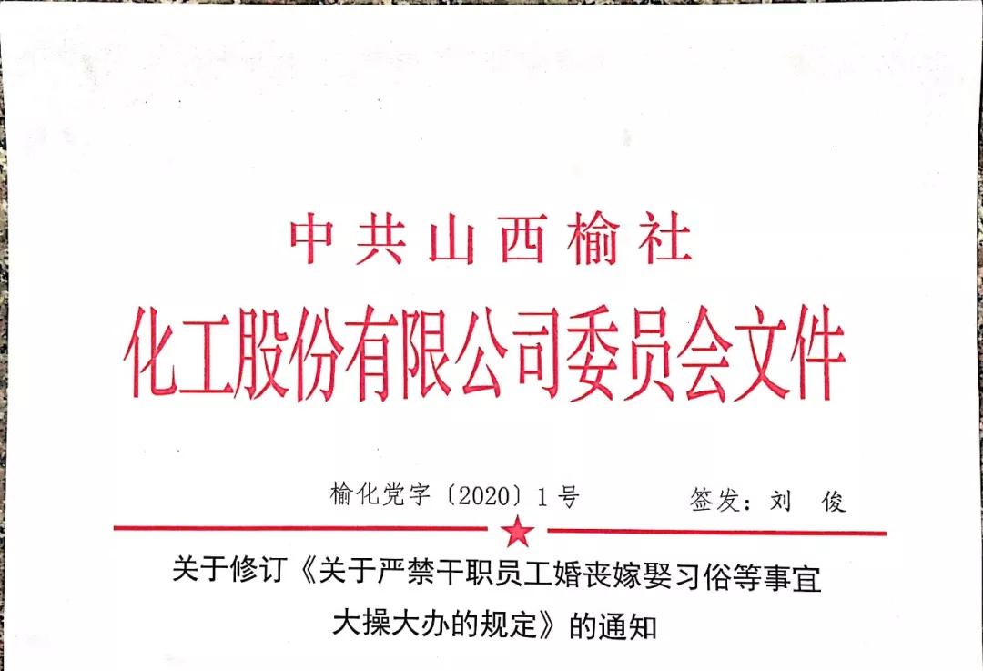 “经办婚丧嫁娶习俗事宜要摒弃陋习,做到文明健康。副厂、部级以上领导遇本人结婚或子女嫁娶,要向公司监事会申报。丧事一律选用大烩菜,结婚或子女嫁娶宴请酒席饭菜可采用大烩菜或六菜一盆(盆:烩菜)”。