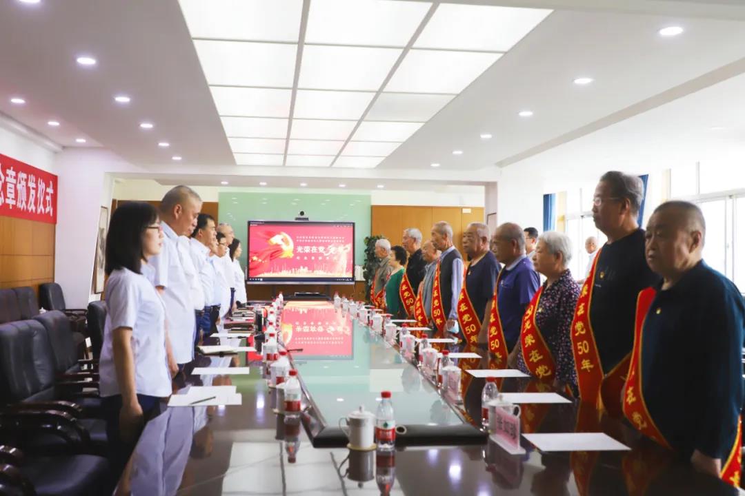 仪式在雄壮的国歌声中开始,公司党委副书记郜建军、开发区党工委书记王卫东为10名党员代表颁发了纪念章,并对获得纪念章的老党员表示热烈祝贺。获得纪念章的老党员们进行了交流发言,在场党员一起重温了入党誓词。