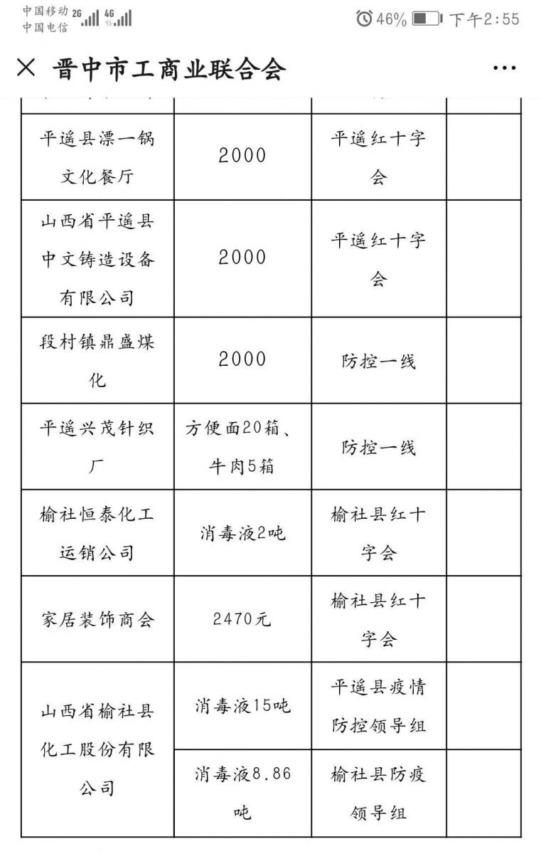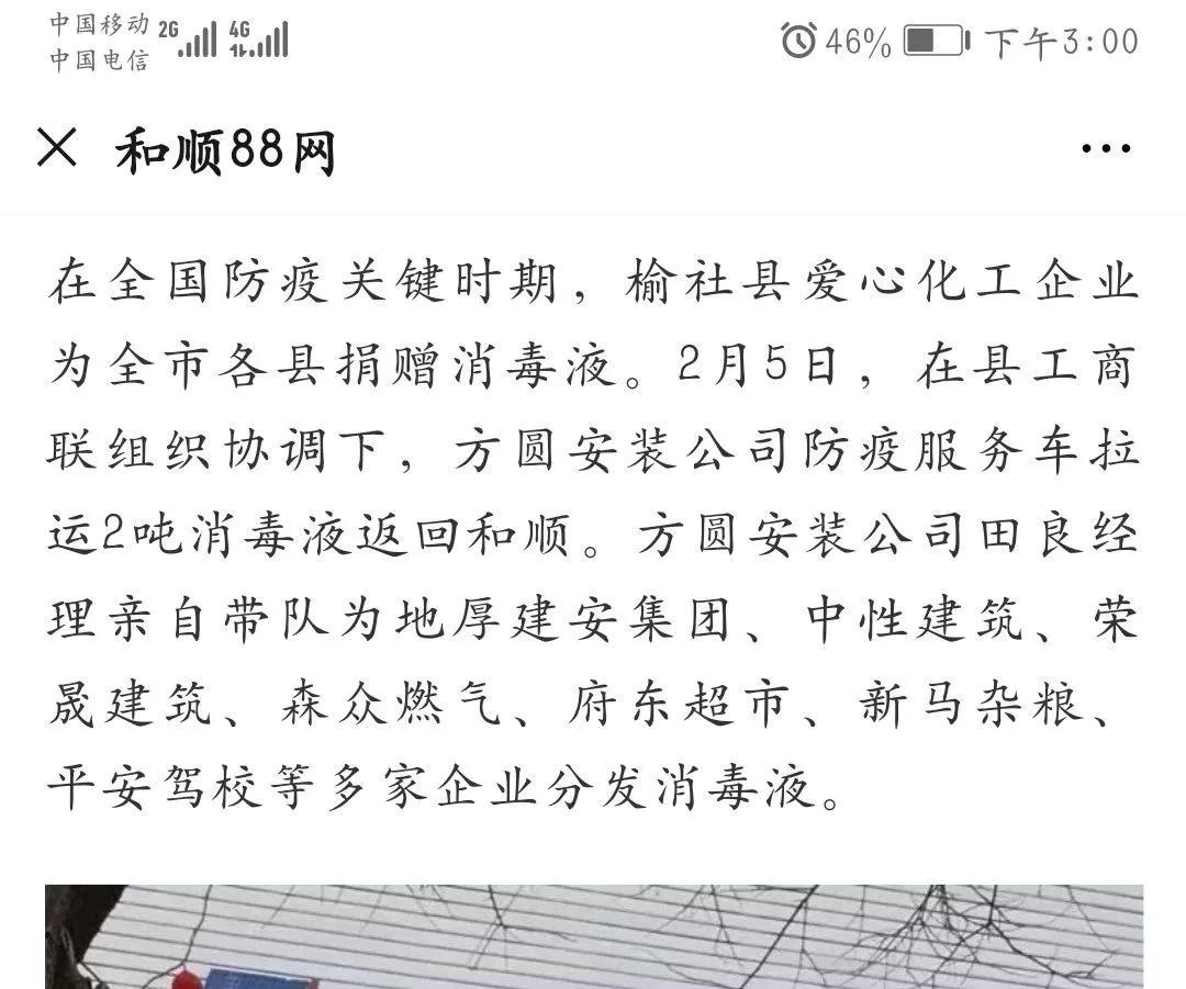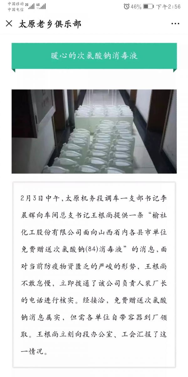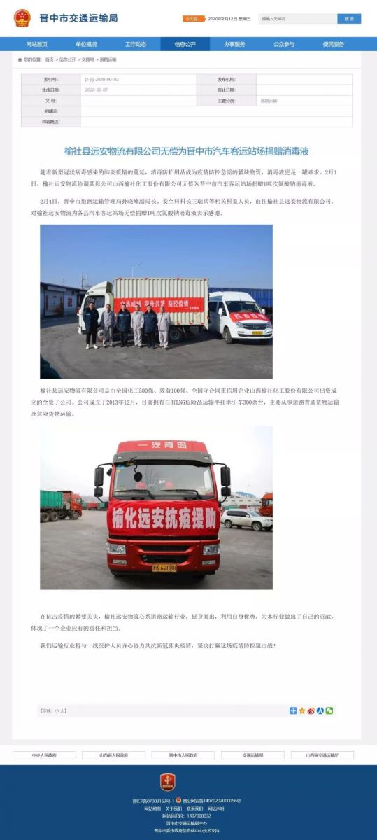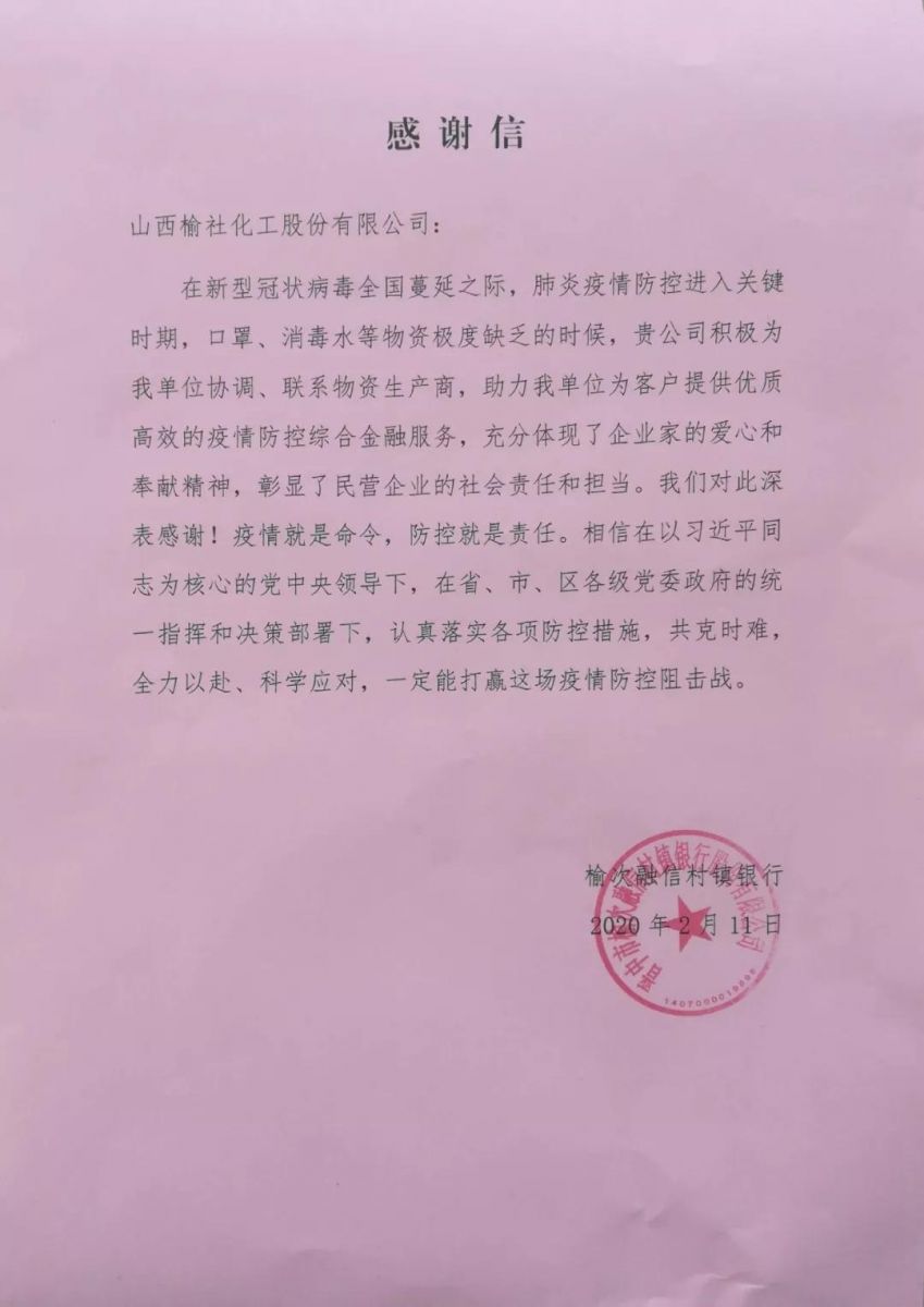 疫情无情,人间有爱。榆化公司于1月31日——2月11日共计为全省范围内357家单位捐赠次氯酸钠消毒液163.545吨。社会各界纷纷对榆化所为表示感谢,晋中市卫生健康委员会、山西日报、晋中市交通运输局、晋中市工商联合会、新浪山西官媒纷纷发文对公司做出的义举表示肯定。